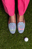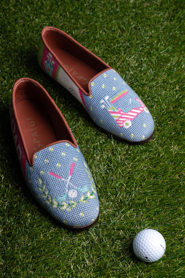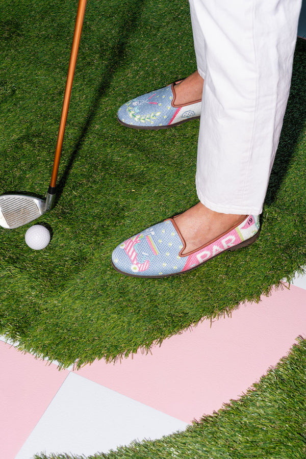 We've stitched up your newest loafer for the 19th hole and beyond. Look chic between rounds of your favorite sport in our adorable needlepoint golf mules. A golf crest with whimsical golf cart and all of your favorite golf accessories stitched around the entire shoe. A handstitched needlepoint smoking slipper with whimsical designs to fit your every mood. Leather trim and lining. Please size up one half size.