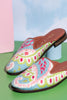 A handstitched needlepoint mule with whimsical designs to fit your every mood. Leather trim and lining.