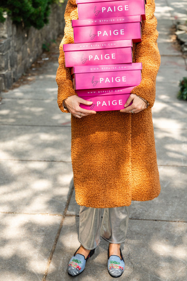 Infuse your winter wardrobe with the warmth of holiday nostalgia. The ByPaige Christmas Tree Farm Needlepoint Loafer showcases a vintage-inspired woodie car topped with a fresh-cut Christmas tree, set against a snowy backdrop. Along the sides, vibrant strings of holiday lights and delicate bows add an extra dash of festive spirit. Each pair is meticulously stitched, ensuring heirloom-level craftsmanship and unmatched comfort. Perfect for festive gatherings, cozy weekends, and holiday travel, these loafers are the ultimate blend of whimsy, tradition, and style. Slip them on and let every step sparkle with Christmas joy.