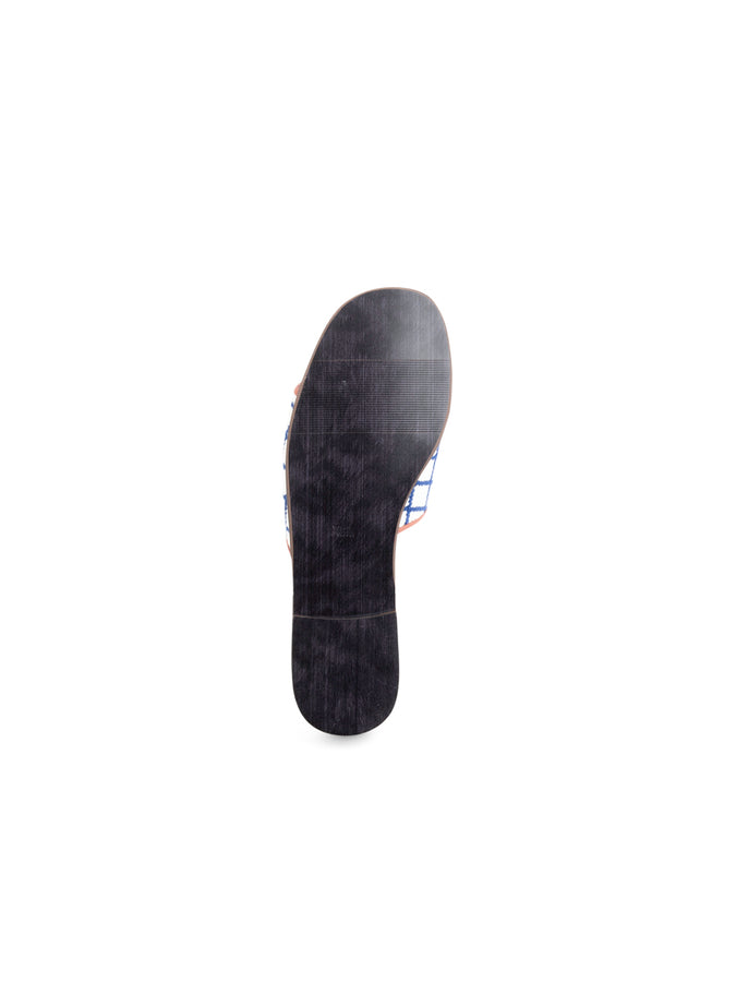 Our best-selling hydrangea print gets a summer makeover on our slip-on flat sandal. The quintessential sandal of summer. We love the curved leather lined strap that cradles your foot perfectly for an ultra comfortable all day sandal. Blue hydrangea flowers stitched on a neutral windowpane blue check.Β