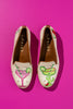 Raise a glass to endless summer with our Margarita Needlepoint Loafer—a playful ode to everyone’s favorite cocktail hour. Each pair features two spirited designs: a pink strawberry margarita stitched on one shoe and a classic spicy margarita on the other, complete with jalapeño, a bright red pepper, lime wedges, and a tiny embroidered salt shaker. Set against a creamy neutral canvas sprinkled with pink and green dots, this stitched style brings a festive twist to everyday dressing.