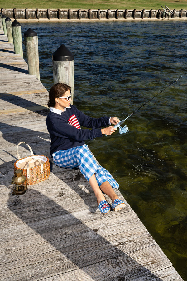 Meet the Needlepoint Loafer in Preppy Flag—the most charming, quintessentially By Paige patriotic design yet. Our best-selling flag motif gets a preppy twist with a darling blue-and-white gingham backdrop, scalloped stripes, and an irresistibly sweet bow detail stitched right into the stars and stripes. It’s nostalgic Americana, but elevated with that wink-worthy whimsy Paige is known for.