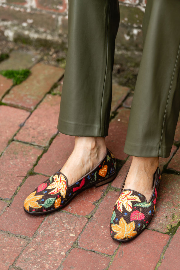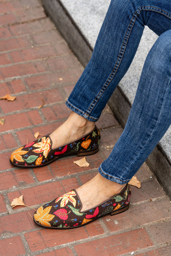 Step into the coziest season with the ByPaige Needlepoint Loafer in Fall Leaves — a luxurious blend of artisanal craftsmanship and fall fashion flair. Stitched with meticulous detail, each pair features a rich tapestry of golden yellows, burnt oranges, deep reds, and earthy greens, capturing the magic of leaves gently drifting to the ground. The dark chocolate background provides a striking contrast, letting the vibrant autumn palette truly shine. Perfect for crisp morning strolls, afternoon gatherings, or evenings by the fire, these loafers are as versatile as they are beautiful. With their buttery leather trim and cushioned insole, you’ll enjoy lasting comfort alongside impeccable style. Whether paired with jeans, cozy knits, or tailored trousers, the Fall Leaves design is your go-to statement shoe for the season.